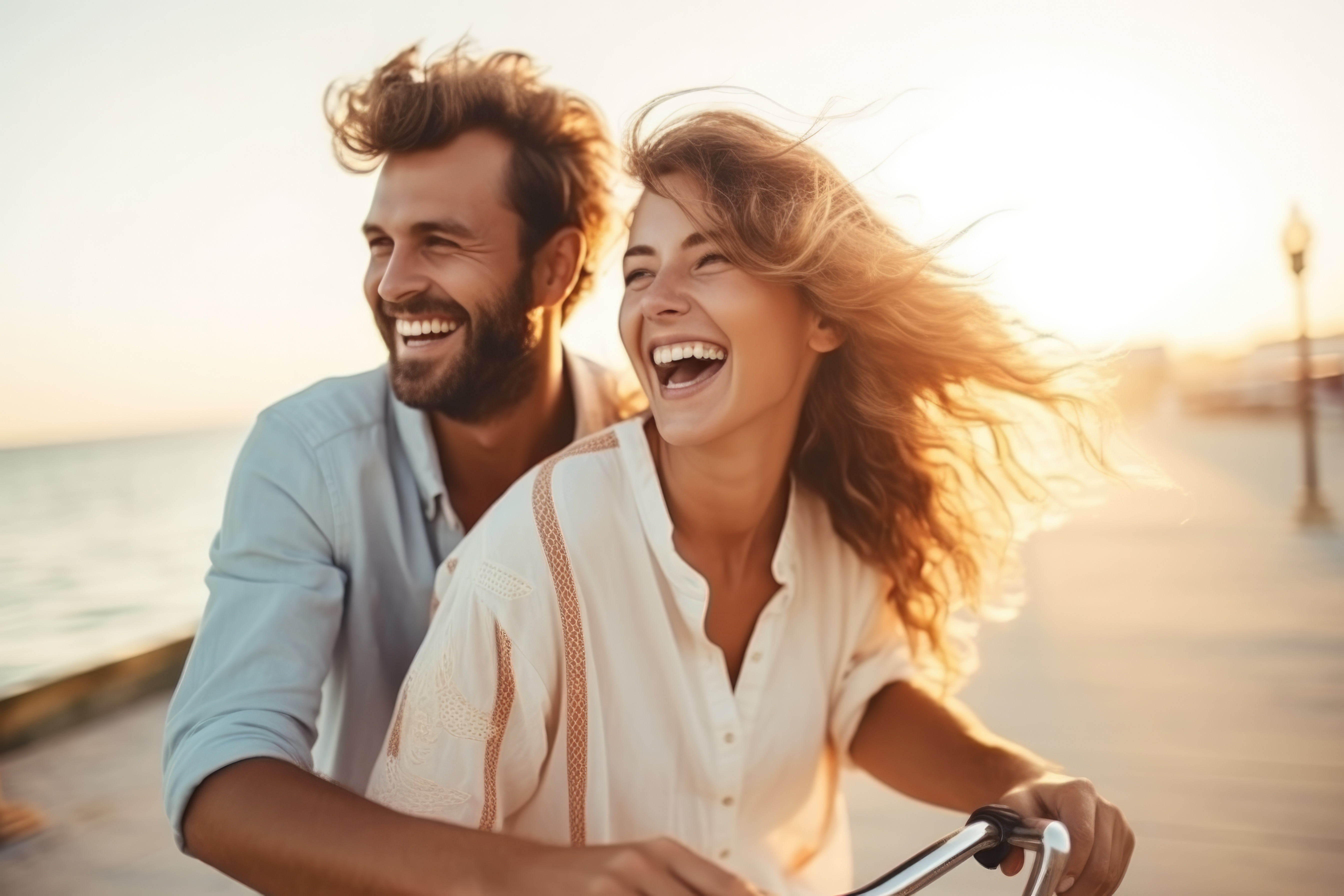 Previous Image Joyful young caucasian couple riding bicycles together, on the seaside promenade Joyful young caucasian couple riding bicycles together, on the seaside promenade.